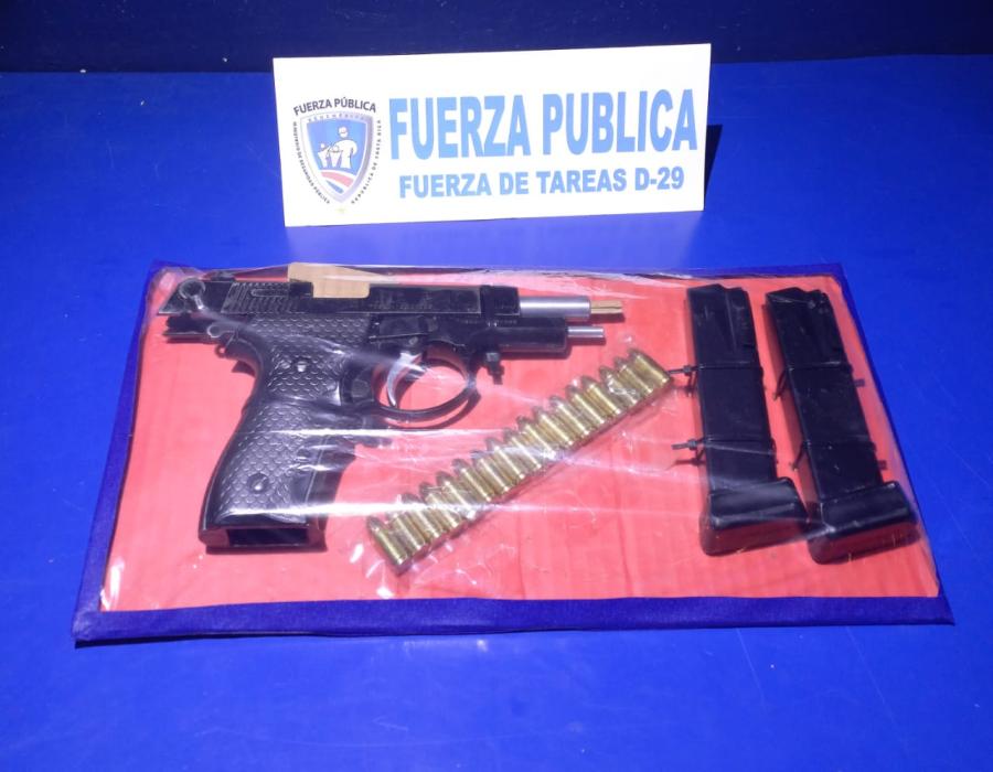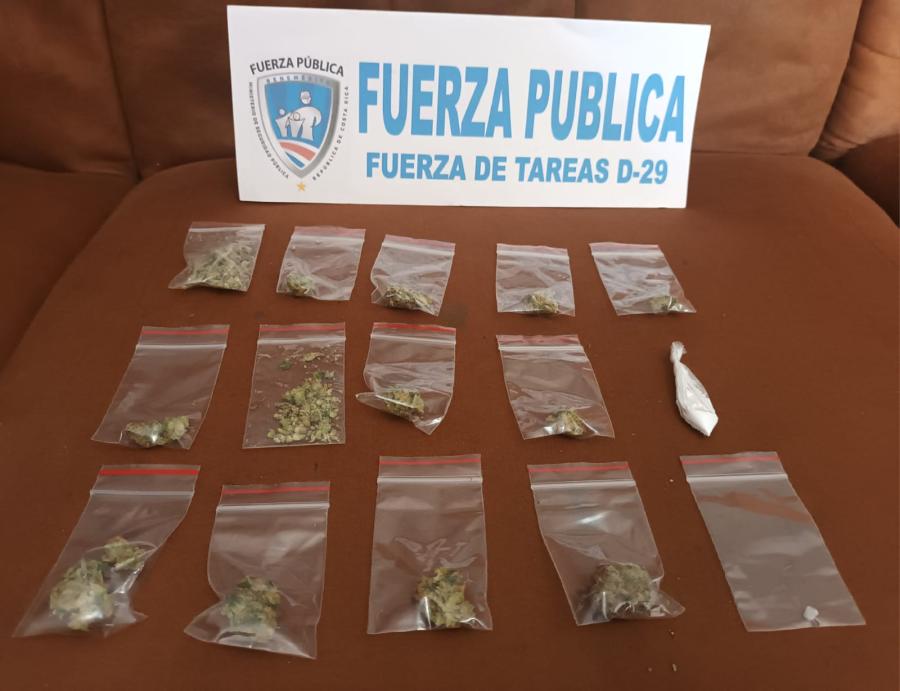 Al sospechoso se le decomisa droga: 13 envoltorios con posible marihuana, un envoltorio con cocaína y una dosis de crack, además de un arma de fuego marca Kanunis calibre 9mm, color negro, misma tiene denuncia por robo en Alajuela.