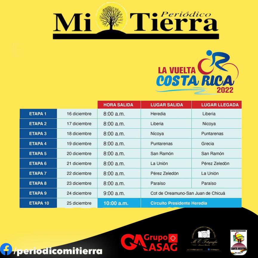 La vuelta se inicia este viernes 16 de diciembre, con el trayecto entre Heredia y Liberia y finaliza el 25 de diciembre con el Circuito Presidente en la Aurora de Heredia, tendrá 10 etapas en total y contará con cinco equipos internacionales y nueve nacionales.