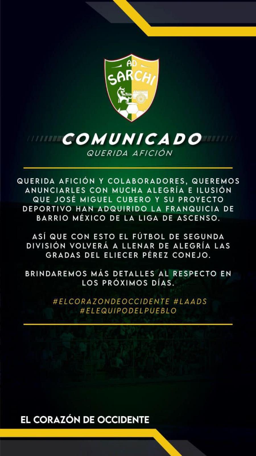 La Asociación Deportiva Sarchí oficializó mediante su perfil de Facebook, la adquisición de la franquicia de Barrio México en la Liga de Ascenso.