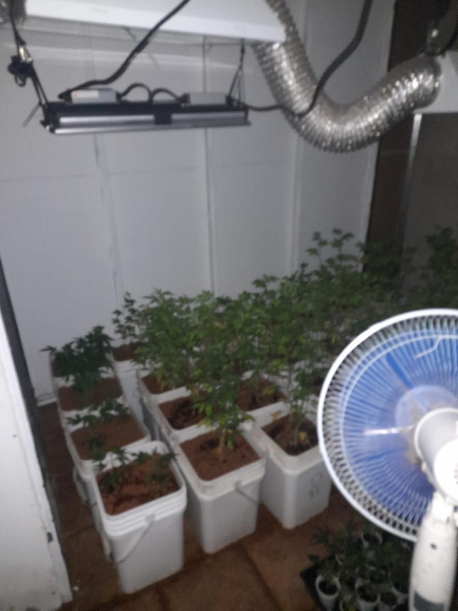 Al entrar a la casa, se encuentra sin ocupantes, en uno de los cuartos, el cual se subdividen en dos pequeños, observan varias matas de aparente droga marihuana sembrada en baldes plásticos blancos, abanicos, luces especiales, conductos de aire, tierra en bolsas y estañones con agua con instrumenstos de oxígeno . Todos los instrumentos para cultivo de hidroponía.
