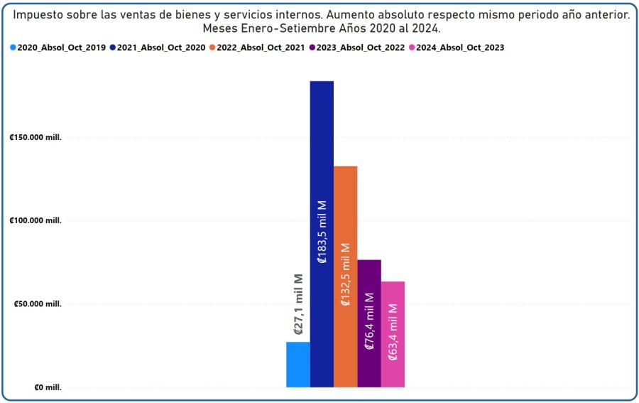 En el año 2019 la recaudación del IVA fue de ¢767 mil millones. Para el año 2020 aumentó en un 3,54% (¢27 mil millones) para llegar a ¢794 mil millones, recordemos que este fue el año en que inició la pandemia. Para el año 2021 aumentó en 23,1% (¢183,5 mil millones) para alcanzar ¢978 mil millones. Este aumento se debe en parte por el impulso generado por la presión almacenada de un año 2020 afectado por la pandemia. En el 2022 aumenta 13,55% (¢132,5 mil millones) a ¢1,1 billones. Para el 2023 el aumento vuelve al crecimiento de un dígito, 6,44% (¢76,4 mil millones) hasta los ¢1,18 billones. Finalmente, en el 2024, con un aumento de 5,34% (¢63,4 mil millones) se recaudó a octubre ¢1,25 billones.