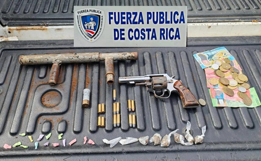 Durante la intervención, se hace el decomiso de un arma de fuego calibre 38, una escopeta tipo hechiza, diferentes tipos de drogas y dinero en baja denominación.